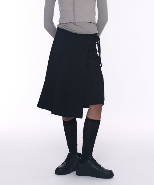 Ribbon Button Pleated Midi Layered Wrap Skirt [Black]