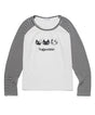 Hugging Raglan T-shirt (White): Stylish with a cute cat print and striped sleeves! Comfort and individuality at the same time.