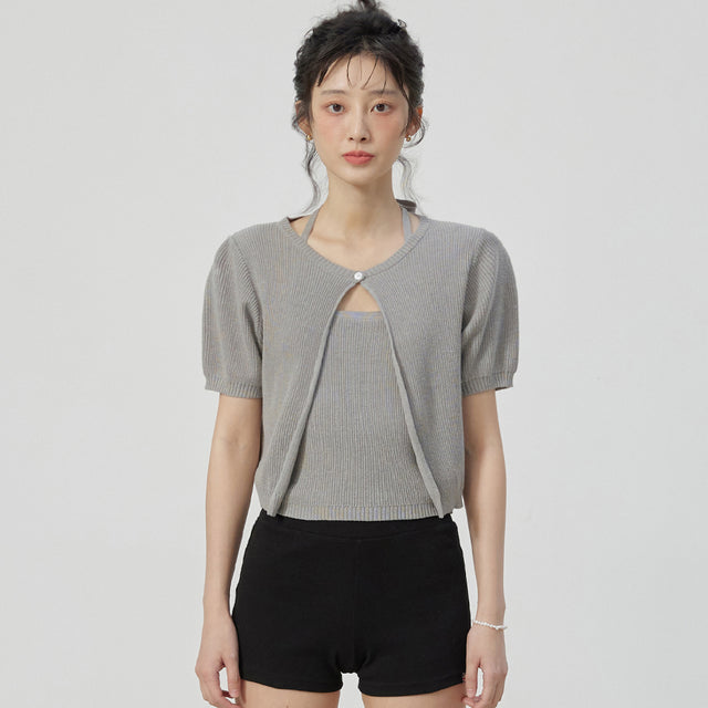 Elevate your style with our Halter Top Cardigan Set in Grey—featuring a chic layered look and a trendy button closure for effortless elegance.