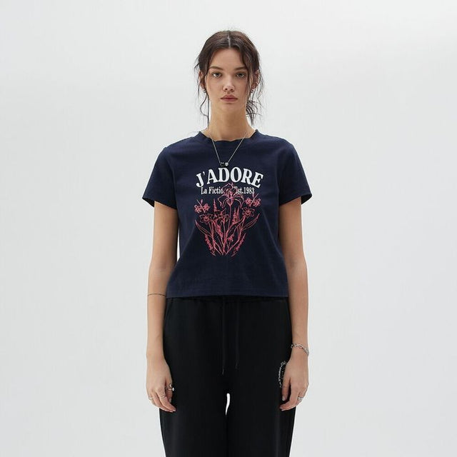 Elevate your casual wardrobe with the LY FLOWER T-Shirt in Navy. Featuring a stylish floral graphic and a trendy cropped cut, it's perfect for any occasion.