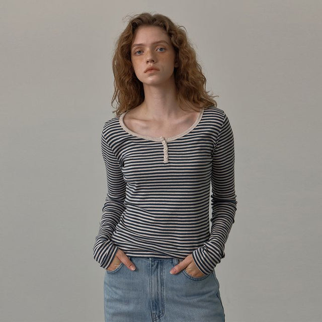 Elevate your casual wardrobe with our Stripe Scoop T-Shirt in Charcoal. Featuring a stylish scoop neckline and button detail, it's perfect for layering.