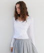 Elevate your style with the V-wrap Button Long Sleeve in pristine white. This chic, versatile top features an elegant wrap design, perfect for layering or solo wear.