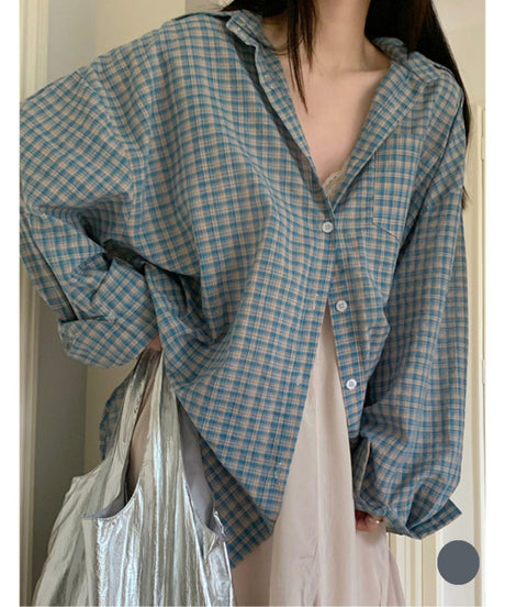 Casual Loose Fit Pocket Small Check Long Sleeve Shirt (WIBCBL025)