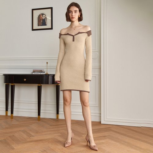 YY_オフショルダー セーター ドレスでスタイルをアップグレードしましょう。着心地がよく、シックで、どんな場面にもぴったりです。エレガントさを楽々と取り入れましょう。