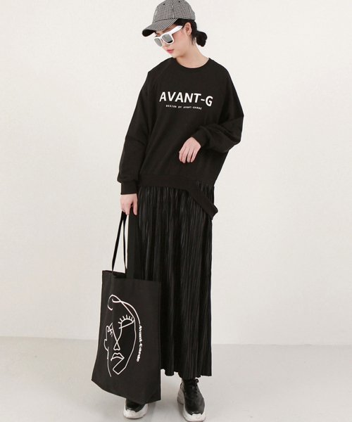 プリーツ裾コントラストスウェットシャツ付きブラックドレス - ユニーク