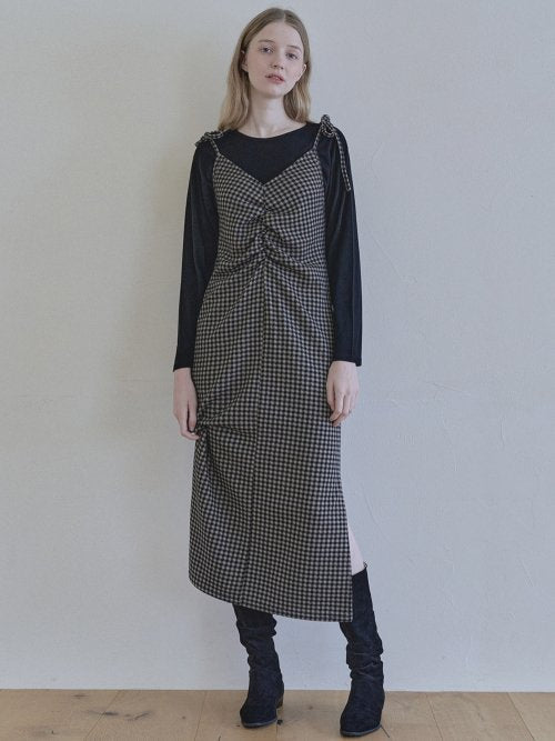 チェックシャーリングロングワンピース - ブラック