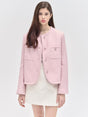 Elevate your style with the 25SN Mellow Tweed Jacket in soft pink. This chic, textured piece features a modern design and practical pockets. Perfect for any occasion!