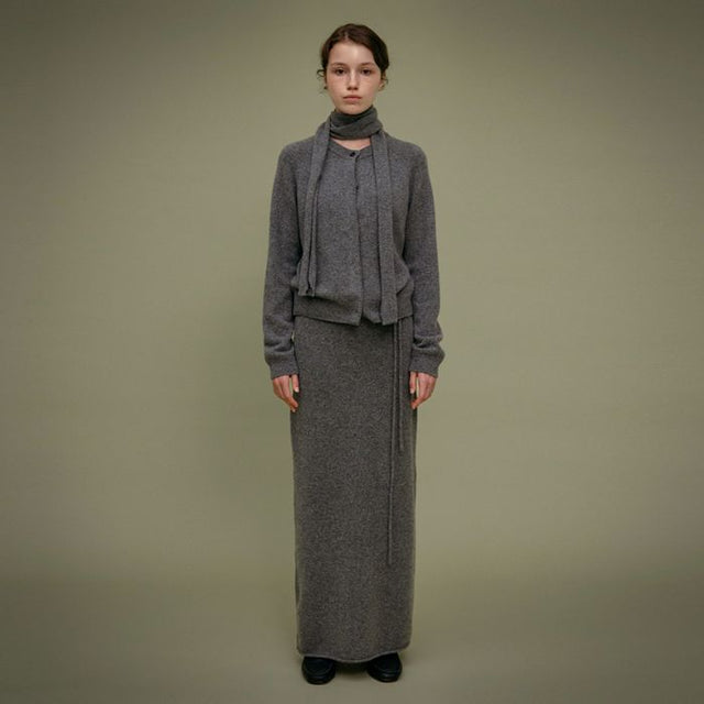 Elevate your style with our Merino Wool Blend String Knit Skirt, featuring a soft texture, elegant drape, and adjustable tie for a perfect fit.