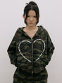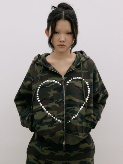 ハートスタッズ パーカー ジップアップ カモ:スタイリッシュなカモ柄とハートスタッズで個性をプラスしたパーカー。快適さとトレンド感を両立!