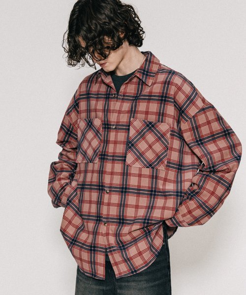 コーデュロイ オーバーサイズ チェックシャツ_ピンク