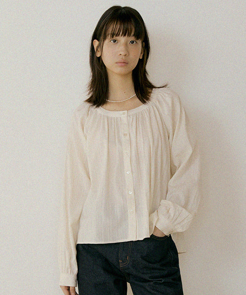 クリーム色のストライプ シャーリング ボリューム ブラウスでスタイルをアップグレードしましょう。気負わずシックで、どんな場面にもぴったりです。