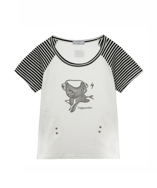 ロックスター ハグ T シャツ (ホワイト): スタイリッシュなストライプの袖とかわいいロックスター プリントで個性をプラス! 快適さとスタイルを同時に実現。