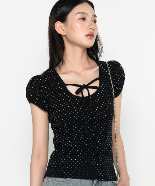ハイスクールディスコのパフスリーブドットリボンTシャツでスタイルを完成させましょう!かわいいドットとリボンのディテールで魅力を放ちます!