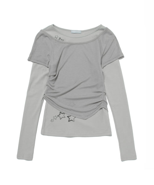 レイヤードスターTシャツ(グレー):スタイリッシュな星柄とレイヤードデザインで、快適さとスタイルを同時に実現!デイリールックにぴったりのアイテムです。