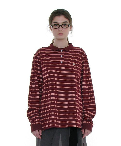 バーガンディのストライプ柄長袖ポロTシャツ:スタイリッシュなバーガンディのストライプ、快適なフィット感で毎日の装いにぴったり!
