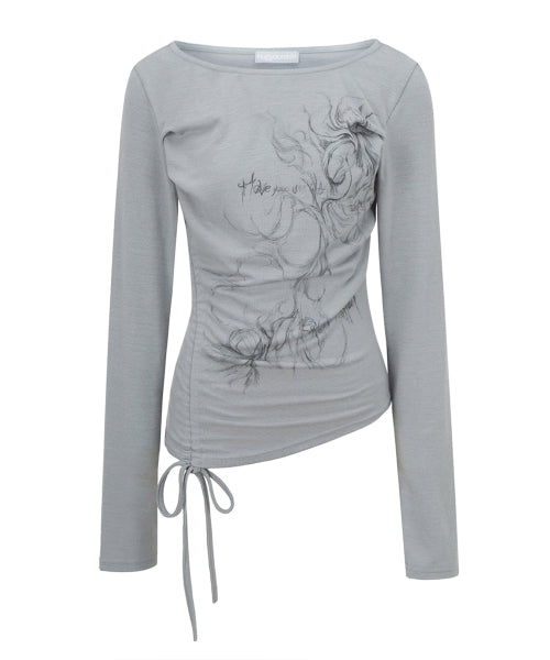ボートネック シャーリング T シャツ (グレー): エレガントなシャーリングのディテールでスタイルを完成させます。快適さと洗練さを同時に実現します。