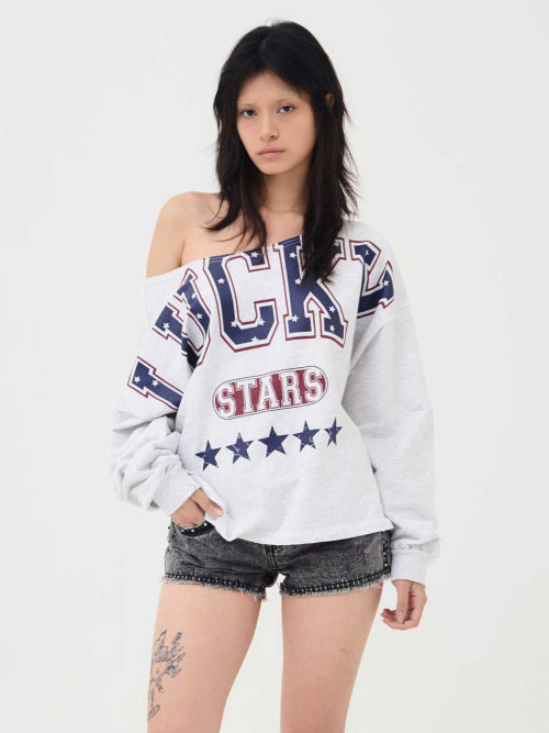 ラッキースター スウェットシャツ メランジグレー: 快適さとトレンド感を兼ね備えたスタイリッシュなオフショルダーデザイン! デイリールックにぴったりのアイテムです。