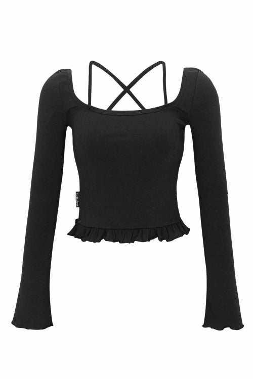 ROSY TOP-BLACK でスタイルをアップグレードしましょう。シックなクロスストラップと魅力的なフリルの裾が特徴で、どんなシーンにもぴったりです。