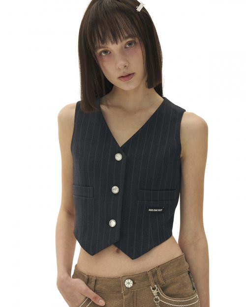 ネイビーの 3 ボタン ストライプ ベストでスタイルをアップグレードしましょう。スタイリッシュでシック、どんな場面にもぴったりです。今すぐ手に入れましょう。