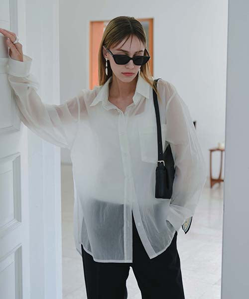 シースルールーズシャツ_ホワイト: 洗練されたスタイルと快適さを同時に実現! シースルーデザインでどこにいても目立ち、エレガントさをプラスします。