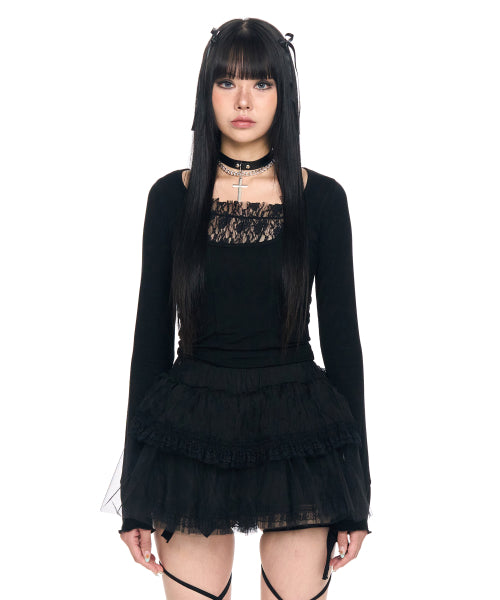LACE OJO TOP BLACK でスタイルをアップグレードしましょう。エレガントなレースのディテールが特徴のこのトップスは、シックでエッジの効いたルックに最適です。