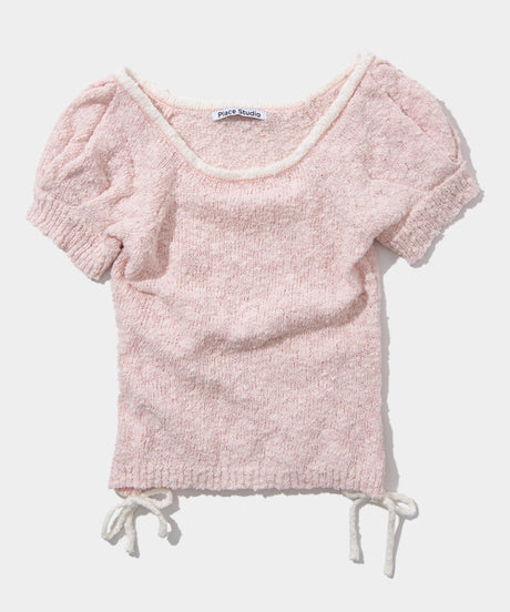 サイドリボンストラップポイントパフ半袖ニットトップス[ピンク]