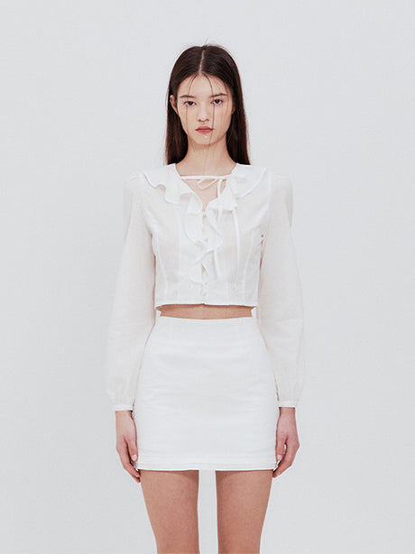 フリルリボンストラップラウンドネッククロップ半袖ブラウスシャツ[スカイブルー]