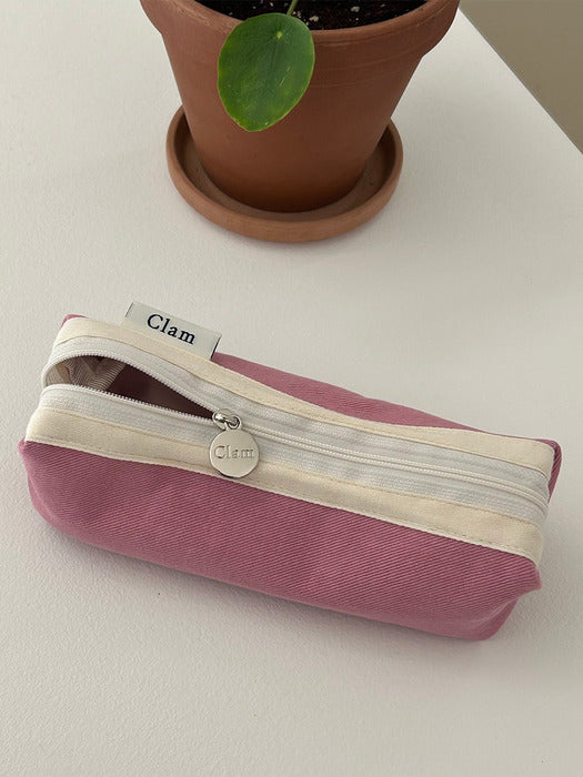 スタイリッシュで実用的なドライピンクのクラム ラウンド ペンシル ケースは、必需品をセンス良く整理整頓できます。学校やオフィスに最適です。