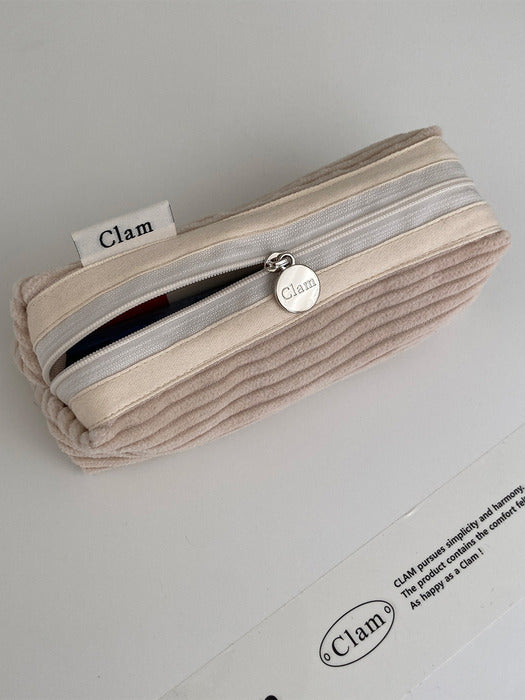 クラム ラウンド ペンシルケース - コーデュロイ ココナッツ: スタイリッシュでコンパクト、そして丈夫。シックなタッチで必需品を整理するのに最適です。