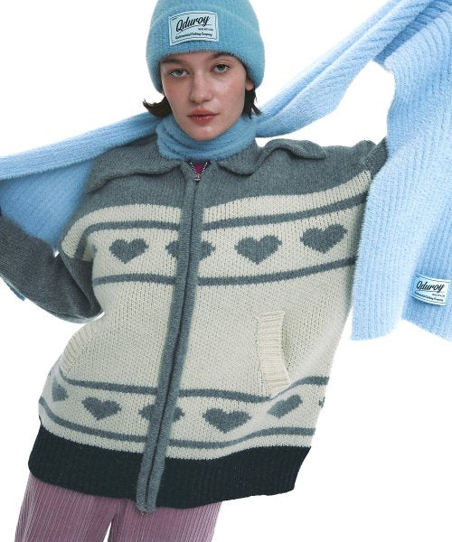 ハート ジップアップ ニット ジャケット - ペンギン: 暖かさとスタイルを同時に実現! 愛らしいハート柄で冬のファッションを完成させましょう。