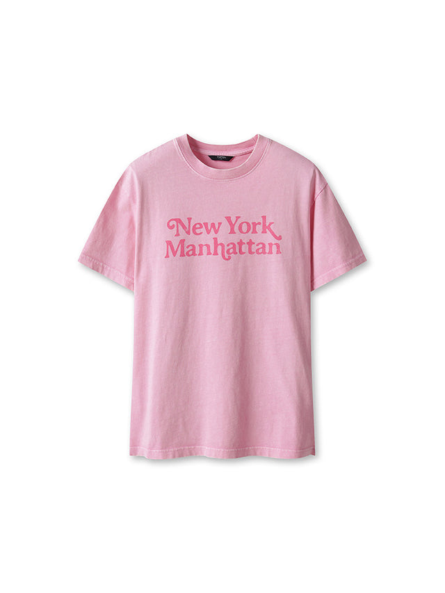 Embrace urban style with our Garment Dying Graphic T-shirt. Soft pink fabric showcases bold "New York Manhattan" print for a trendy, casual look.